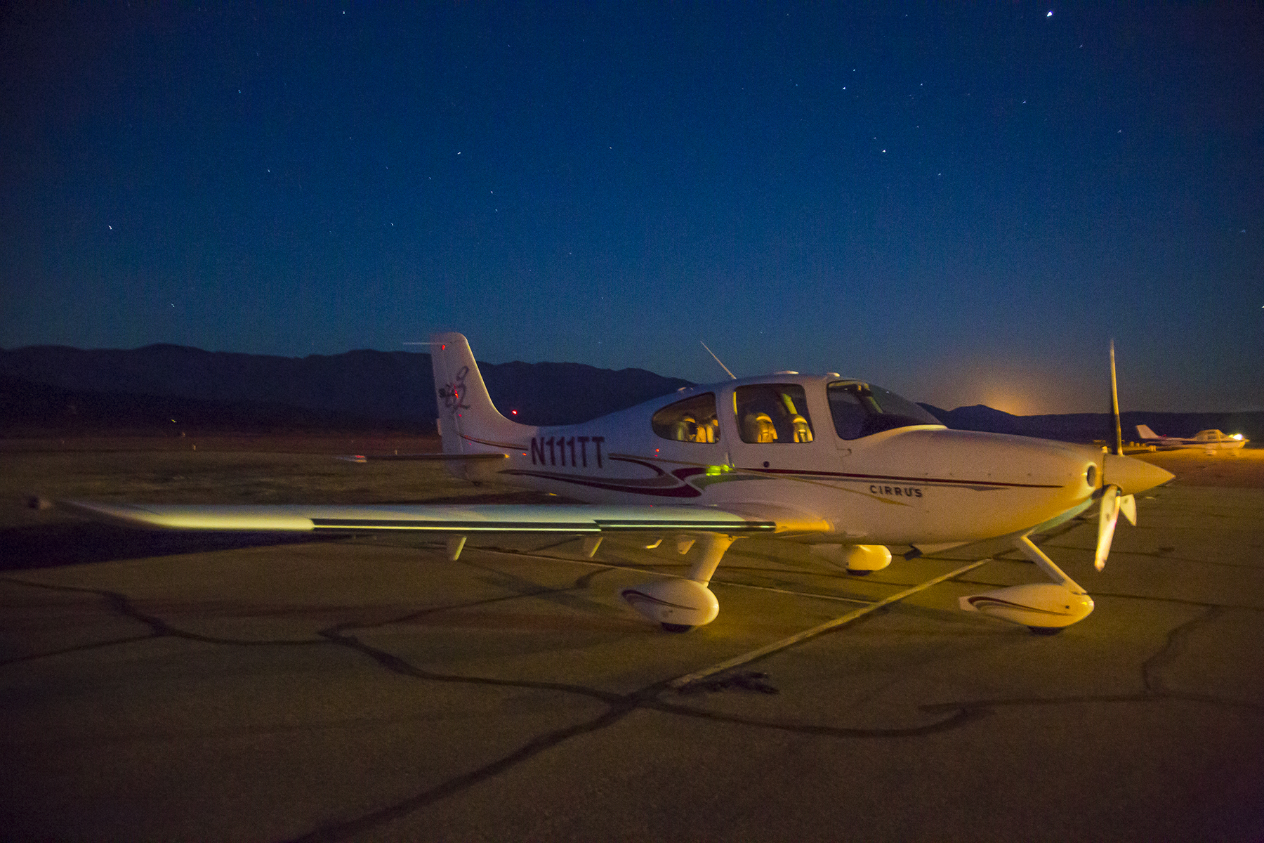 And then, the day over, an hour after sunset, time for another moonrise. The Cirrus carpet-ride awaiting our return flight to San Diego, posing with the lunar glow as the moon rises over the Santa Rosa mountains and the Bandlands to the east.