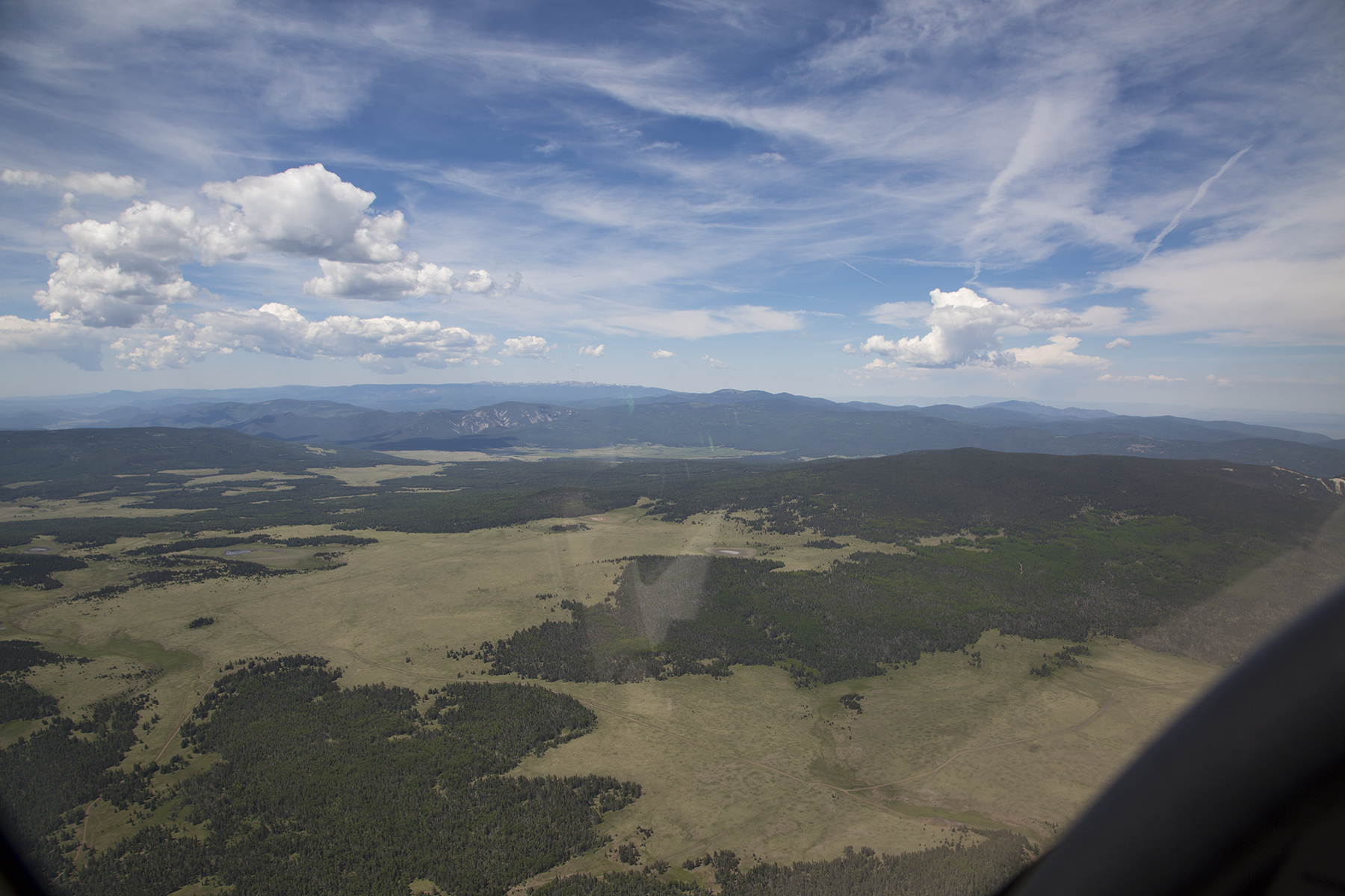 By morning Cathy found a room for us at the Touchstone Inn B & B, and so off we went, still without ground transportation.  Oklahoma, northern Texas and far eastern New Mexico are flat, but that changes abruptly as you near Taos from the east.  Here we are just to the south of Cimarron, and proceeding to overfly the Angel Fire airstrip in a hanging valley between the middle and most distant mountains ahead.   Taos is immediately the other side of the third range.