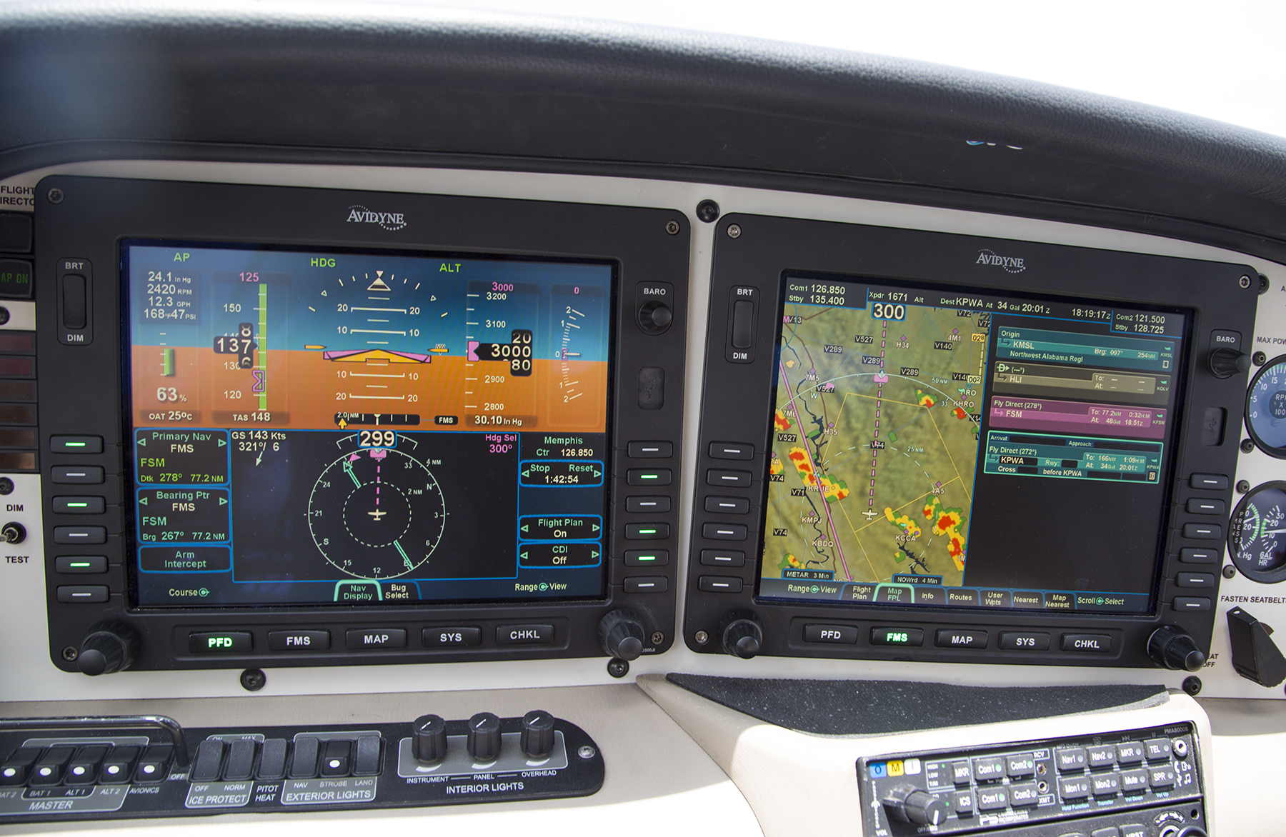 That turned out to be a modestly prudent decision, but prudence only goes so far.  After the briefest of time at Muscle Shoals, our climb out had me threading the eyes of multiple needles to work our way up to a 12,500′ cruise altitude detouring around innumerable towering cumulus to stay in the clear during the climb and at cruise.  Still the gaps between the clouds stayed adequate to continue operating VFR.  See, it turns out that the vertical air currents that produce these towering clouds can produce rather nasty turbulence.  Staying in the clear even if the pilot and the aircraft are capable of flight in the clouds is vastly smoother, and has the advantage of minimizing the risk of inadvertently stumbling into something, well, more or less like what it eventually came to near Fort Smith, to the NW of Little Rock, Arkansas.  It’s that Hmm, thing on steroids, now.  We are still nearly 100 miles away from this developing line of fire-breathing thunderstorms at what is now the early afternoon.  I could discern a portion of the line with less development at our twelve o’clock position, right off the nose in this frame.  I considered diverting ninety degrees left and landing at Little Rock, but figured I could proceed farther westbound before having to commit to that plan, while appraising what was possible in that central slot as time advanced.