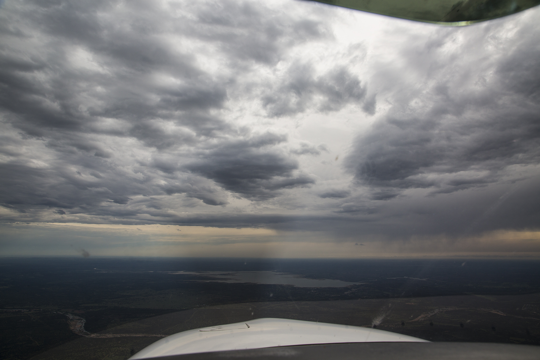 The storm track was moving southeast, and we headed north by northeast, keeping a wary eye on the the VIRGA hanging out of the clouds to our right.  Surprisingly smooth.  In fact, almost all of our flying for the entire vacation was in remarkably smooth air, even in these and other conditions suggestive of hammering us with a severe washboard ride.  I like smooth, thank you.