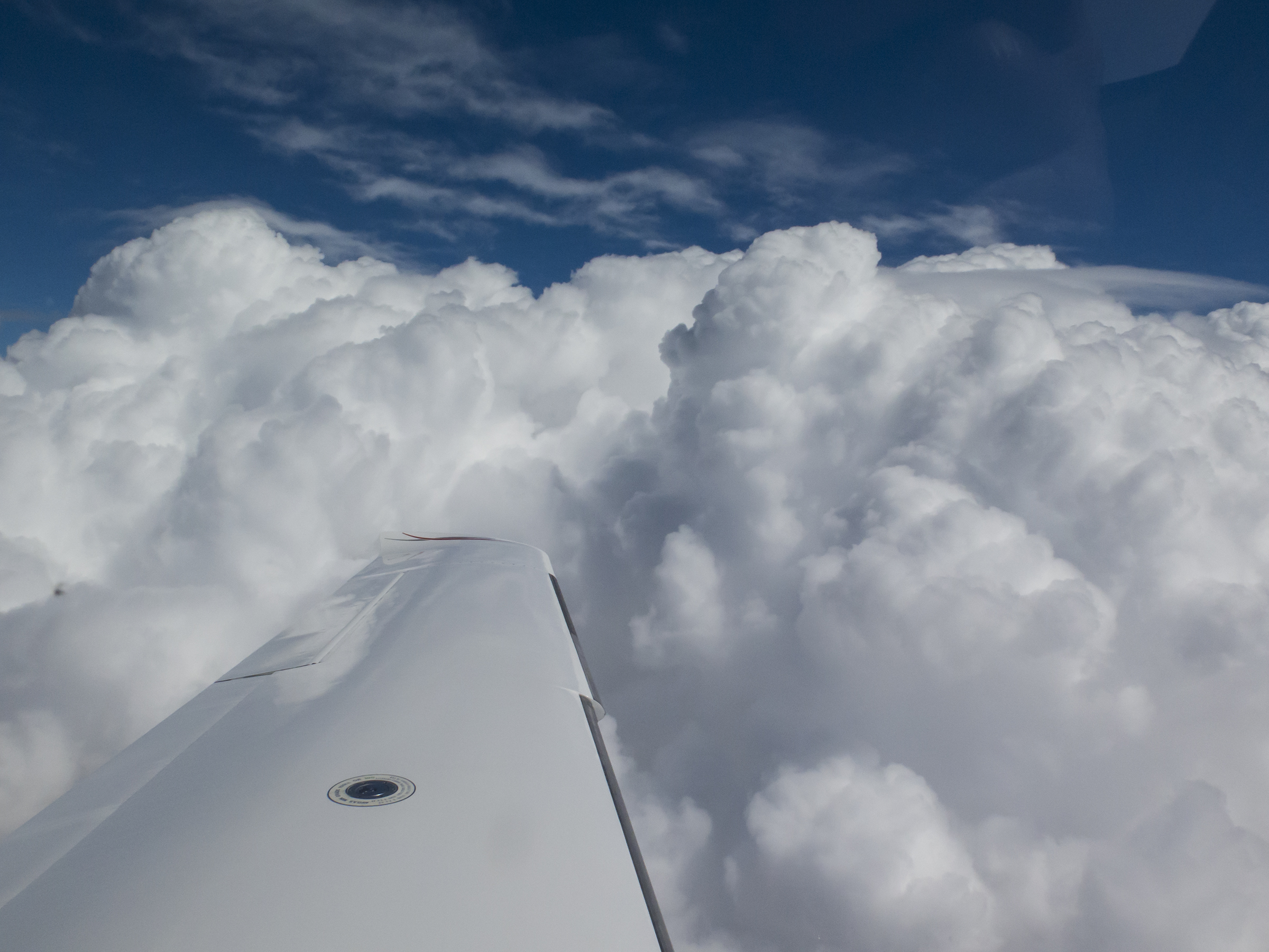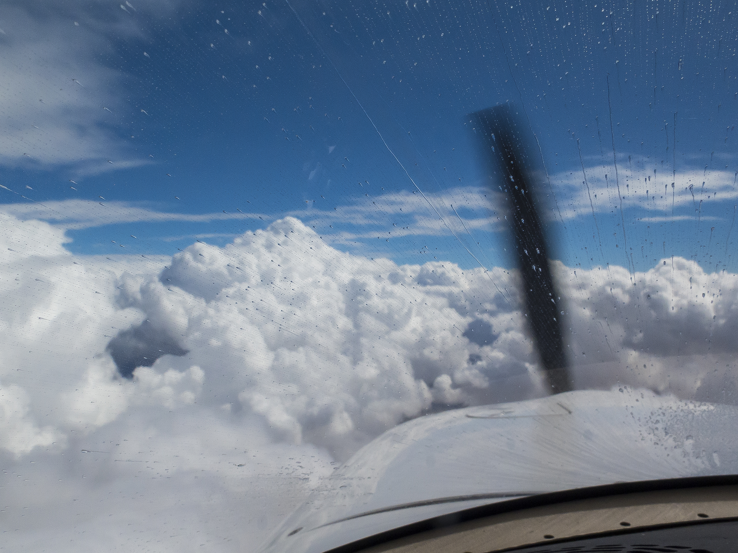 That’s TKS anti-ice fluid streaming back along the windshield, above, for our occasionally unavoidable forays into cloud tops. The higher tops were above 13,000′, and all of them were ice-laden, with many being modest thunderstorms. At least our sashays left and right of course centerline averaged being on course!