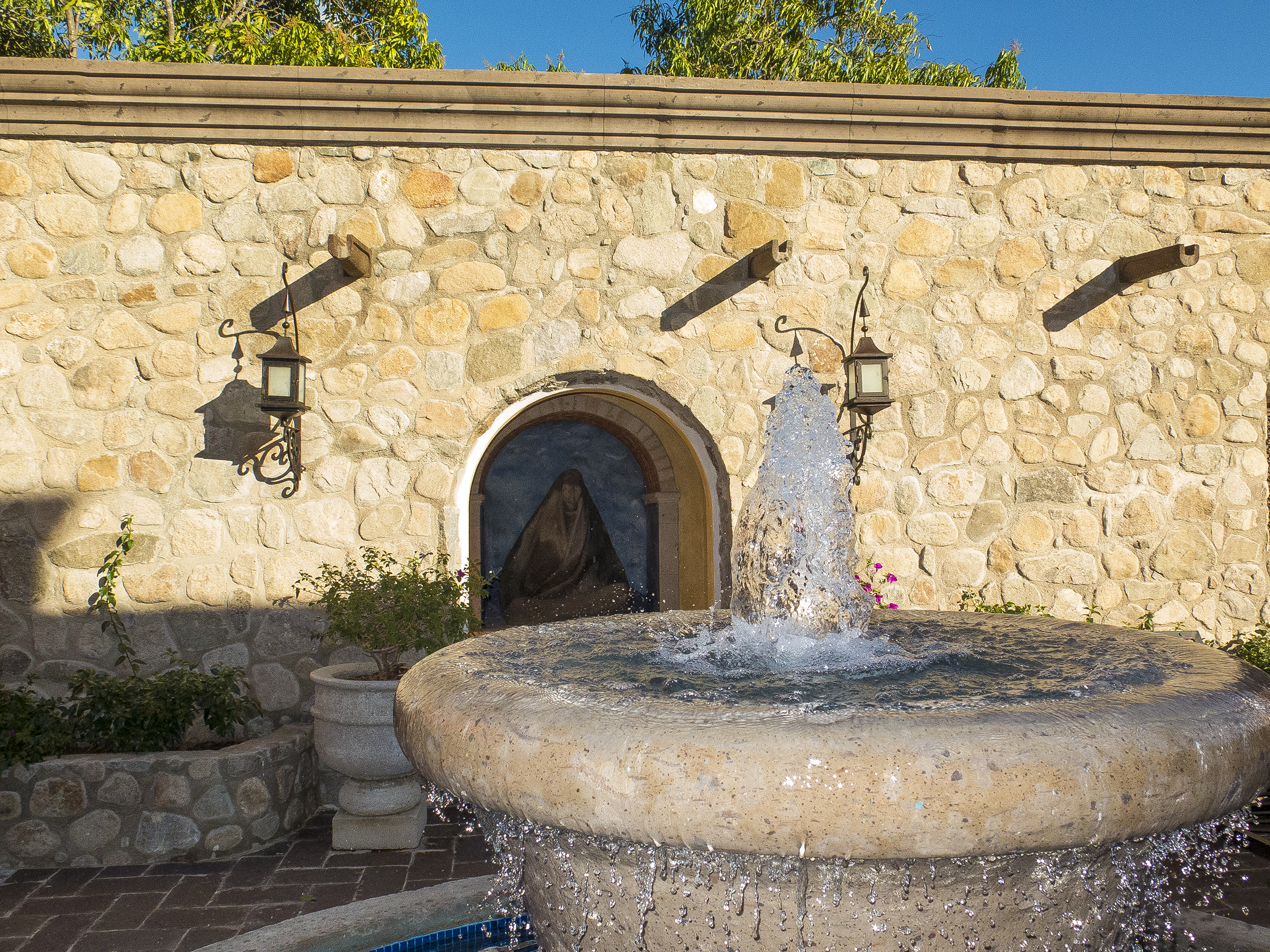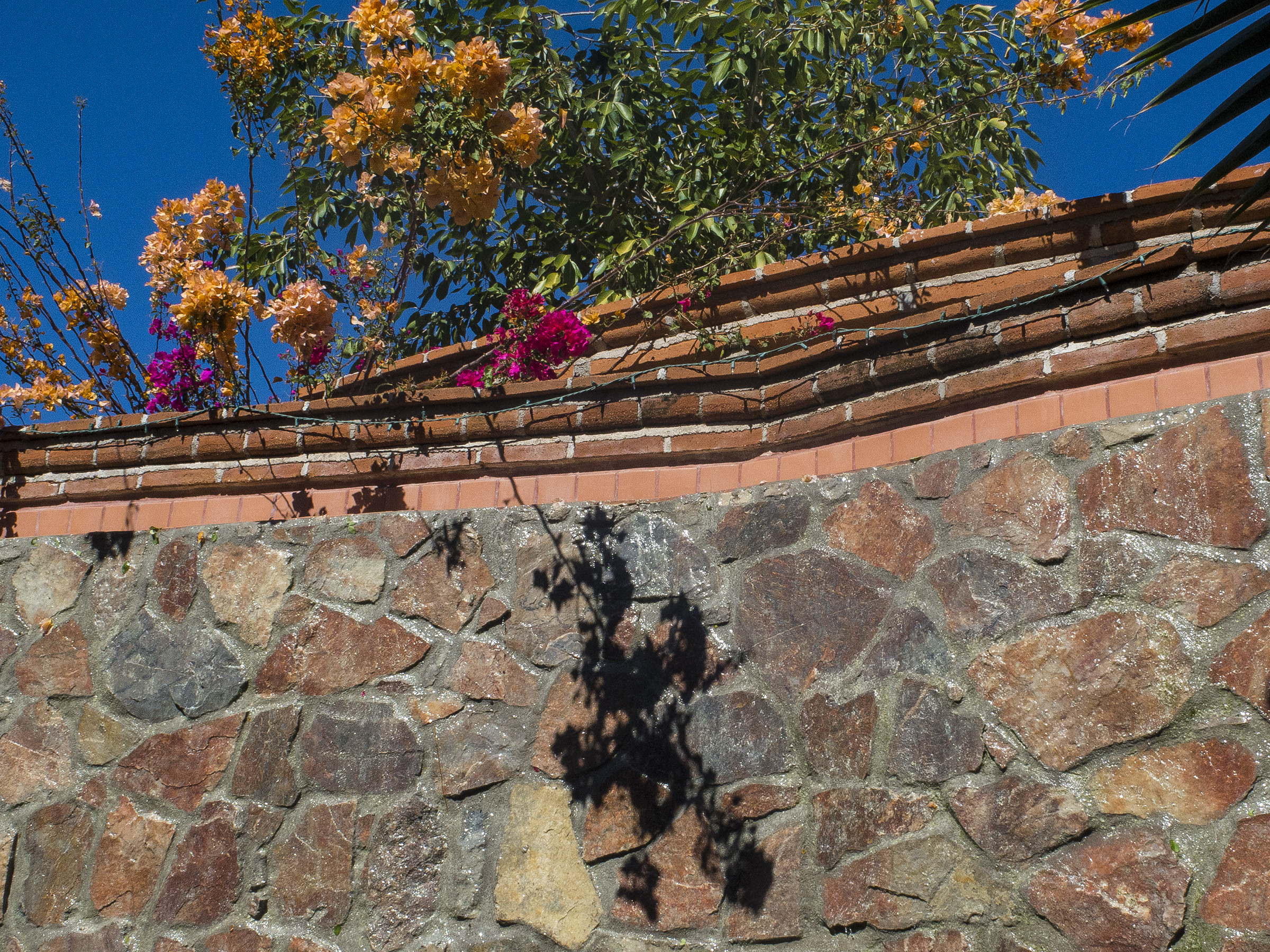 The view within—hand crafted native rock wall, washed from above by a gently sibilant waterfall. Bougainvillea and achingly blue sky.