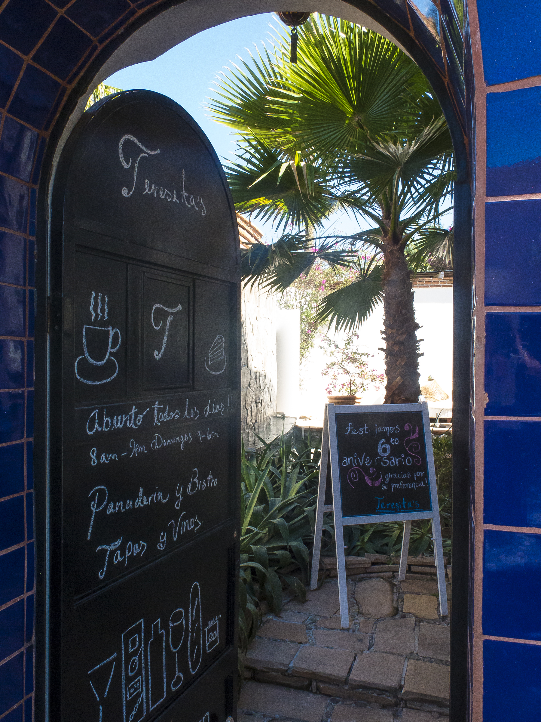 Back down the mountain, in what turned out to be a five mile hike, we followed our exploratory instincts and stumbled upon this delightful tiny cafe hidden behind yet another Alamos arched door set in a thick tiled adobe wall. Teresita’s was all it advertised on its doorway—a bakery and bistro celebrating its sixth anniversary. Everyone but us was local Mexican or expatriate. Cathy chose delightful soft corn tortilla carne tacos and I savored a truly awesome Monte Cristo with homemade dipping preserves as counterpoint to its tangy cheese and spicy mustard interior held in place by egg-battered French toast bread. Artisanal Mexican cerveza to wash down the trail dust, while savoring homemade cheesecakes, floured cakes, cookies and pastries. Boy, howdy.