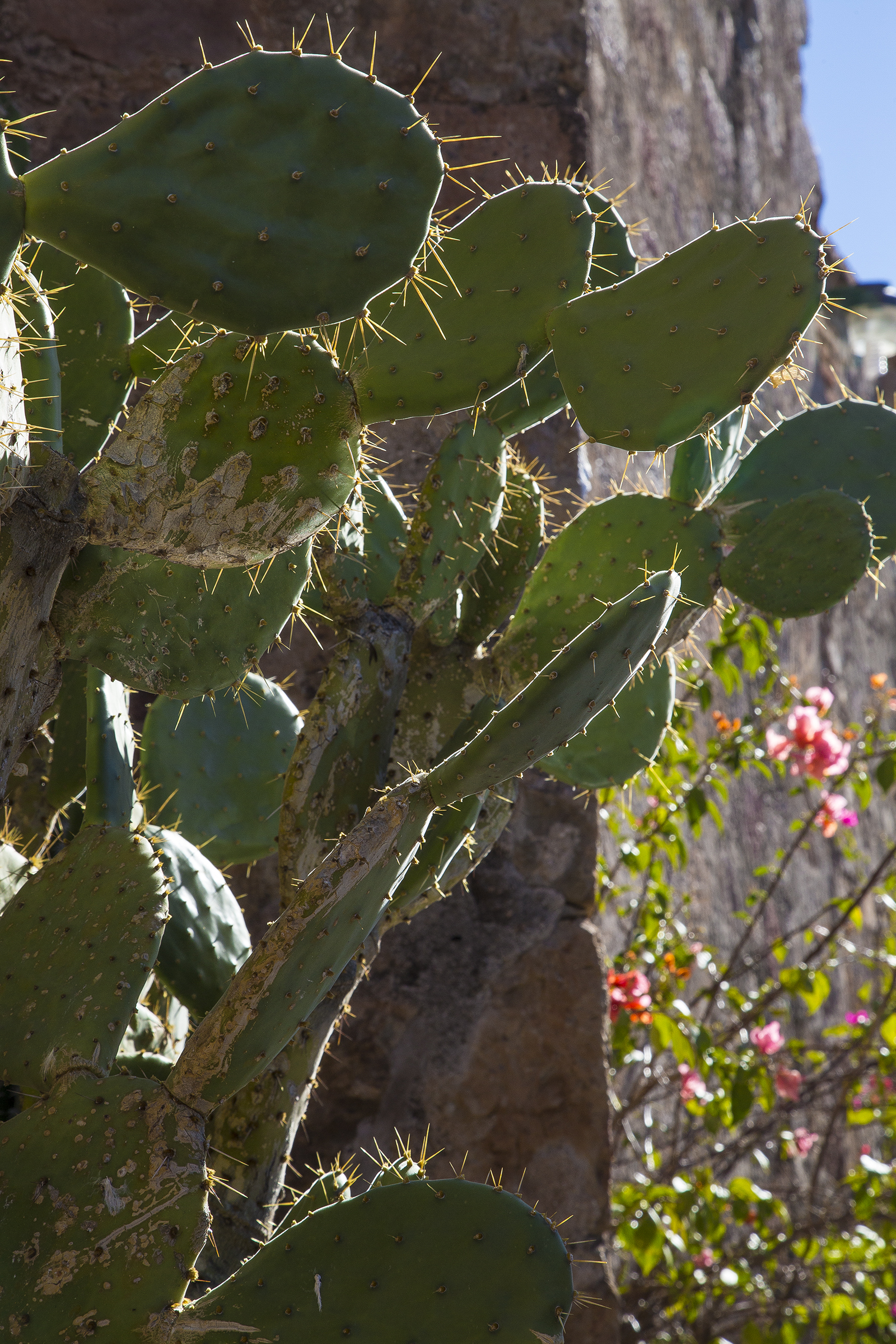 Along the back wall of the iglesia, a typically colorful Sonoran mix of cactus and bougainvillea.